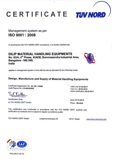 DILIP MATERIAL HANDLING EQUIPMENT is committed to excellence of quality of its products to meet National and international specifications.
